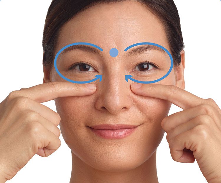 Press between the brows of the third eye with your middle or index finger and stroke the brow around the eye until it is centered. After that, use your fingers to draw an S-shaped motion to loosen and soften the muscles between the eyebrows. Slip it around the eye again, come back to the center, apply pressure, glide, and repeat the ejection. Now repeat the S movement. Repeat this sequence three times (6 total), alternating between Press and S.
